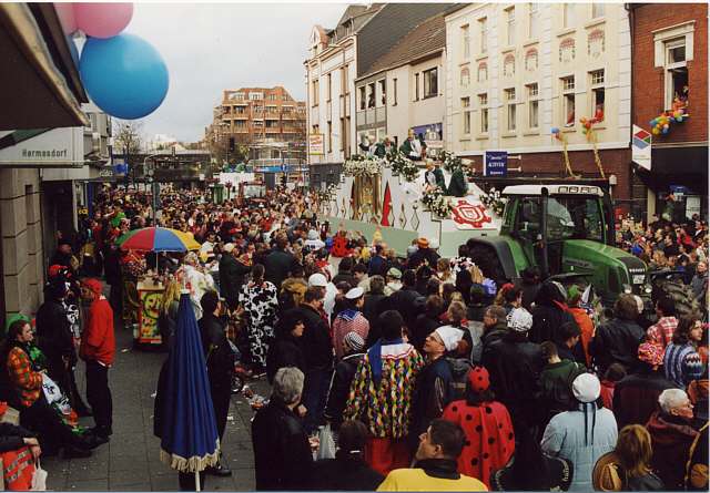 herausgeputzt, bunt geschmückte Wagenmotive sowie verkleidete Narren und Schaulustige am